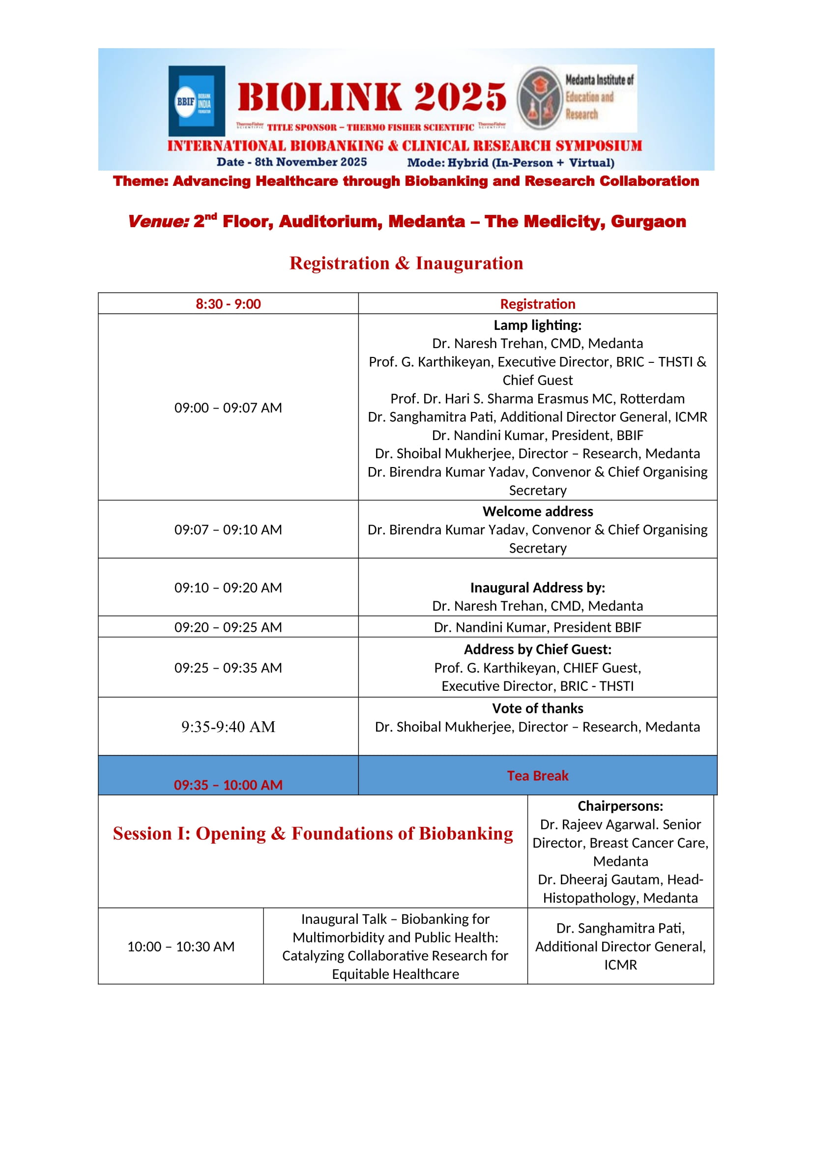 BioLink 2025 – International Biobanking & Clinical Research Symposium is a one-day hybrid event, scheduled on 8th November 2025 at Medanta, Gurugram, bringing together experts, clinicians, researchers, and policymakers to explore the future of biobanking, clinical trials, and clinical research.