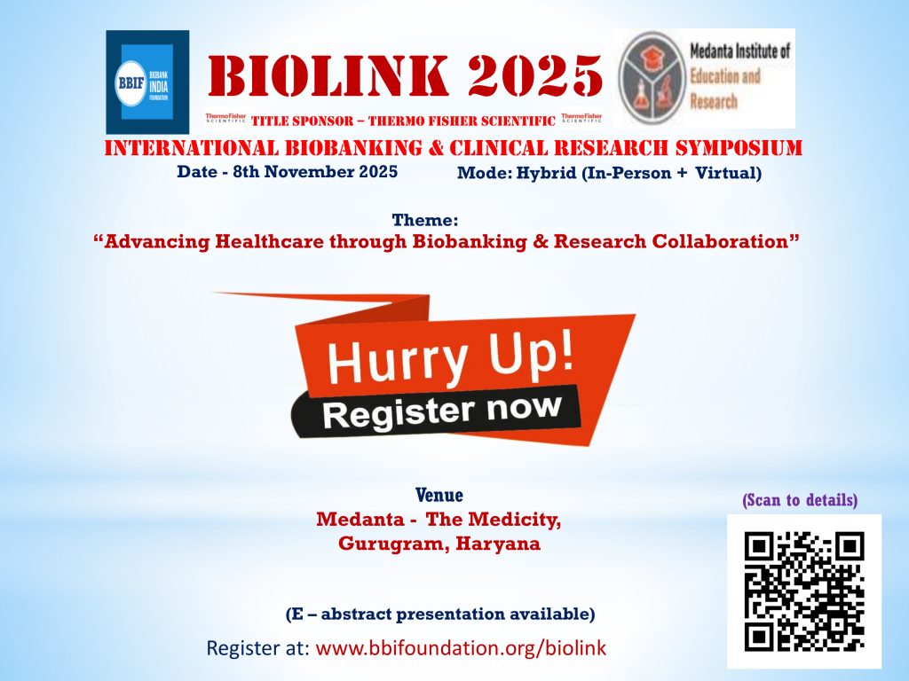 BioLink 2025 – International Biobanking & Clinical Research Symposium is a one-day hybrid event, scheduled on 8th November 2025 at Medanta, Gurugram, bringing together experts, clinicians, researchers, and policymakers to explore the future of biobanking, clinical trials, and clinical research.